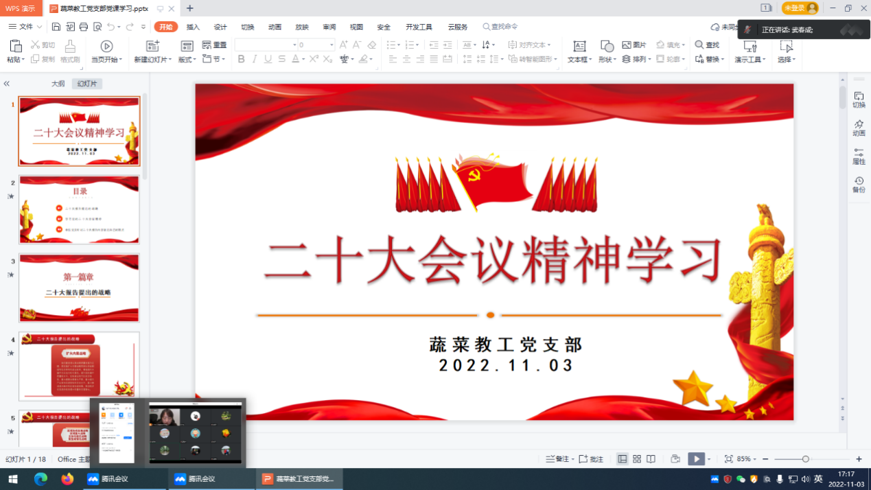 2022年11月3日,FUN88乐天使蔬菜教工党支部以线上会议的形式召开了“学习党的二十大精神”专题会议,支部全体党员同志参与了学习讨论,会议由党支部书记张宁同志主持。