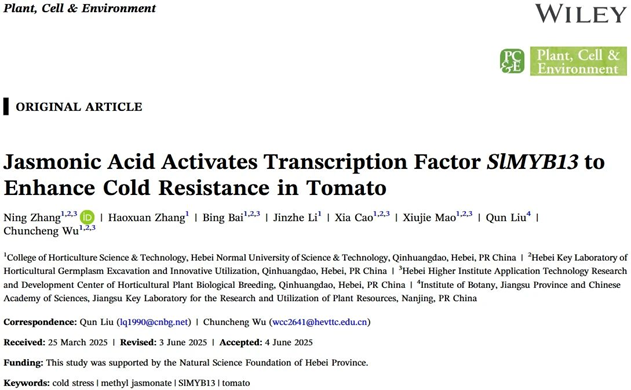 近日,公司蔬菜栽培生理与分子生物学课题组武春成教授团队成员张宁副教授以第一作者身份在Plant, Cell & Environment(中科院1区Top期刊,IF5=7.7)发表了题为“Jasmonic acid activates transcription factor SlMYB13 to enhance cold resistance in tomato”的最新研究成果。本研究通过转录组筛选、遗传和分子机制解析,系统揭示了MeJA–SlMYB13–SlMYC2–SlHSP17.7抗寒调控通路,为低温胁迫下番茄的遗传改良与抗寒品种培育提供了关键靶点和理论基础。张宁副教授于2019年8月进入FUN88乐天使蔬菜教学部工作,现为蔬菜栽培生理与分子生物学团队骨干成员,主要研究方向为蔬菜(番茄、生姜)栽培生理及分子生物学。