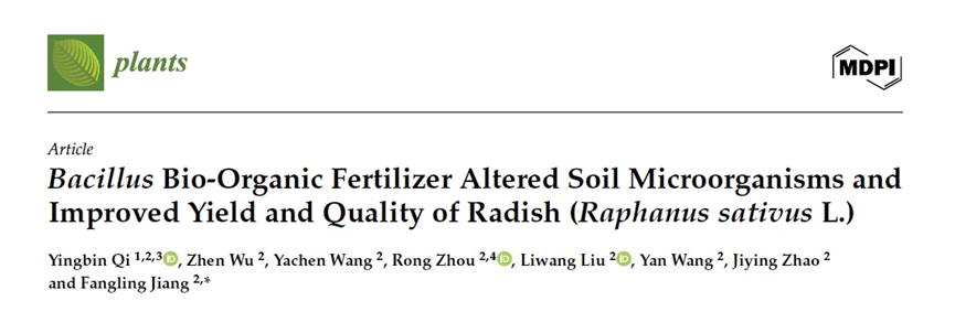 团队成员齐迎斌博士以第一作者身份在Plants-basel(中科院二区,IF=4.1)发表了题为“Bacillus bio-organic fertilizer altered soil microorganisms and improved yield and quality of radish (Raphanus sativus L.)”的最新研究成果。本研究发现施用富含芽孢杆菌的生物有机肥可以改变土壤微生物群落结构,有效提高土壤肥力,从而提高萝卜的产量和品质。齐迎斌博士2023年10月进入FUN88乐天使蔬菜教学部工作,现为公司蔬菜栽培生理与分子生物学团队骨干成员,主要研究方向为蔬菜栽培与生理。(编辑:李兴 审核:武军凯)