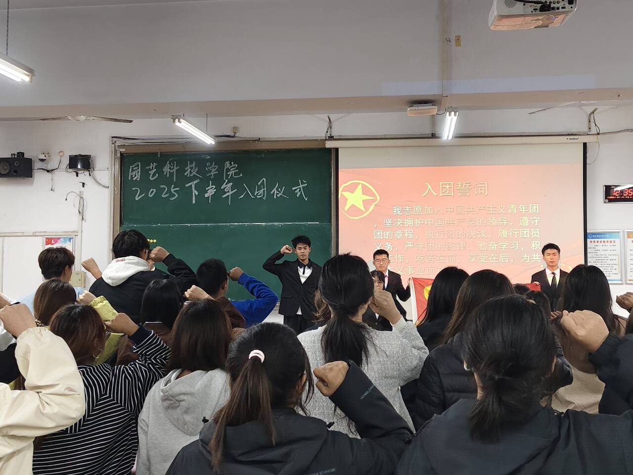 入团仪式在庄严的团歌声中拉开帷幕。首先,院团委负责人宣读新发展团员名单。随后,新团员代表上台发言,她表示未来将以实际行动践行入团的初心,展现新时代团员的良好风貌。最后,全体新团员举起右拳,面向鲜红的团旗庄严宣誓。铿锵有力的誓言充分展现出新时代青年坚定的理想信念。